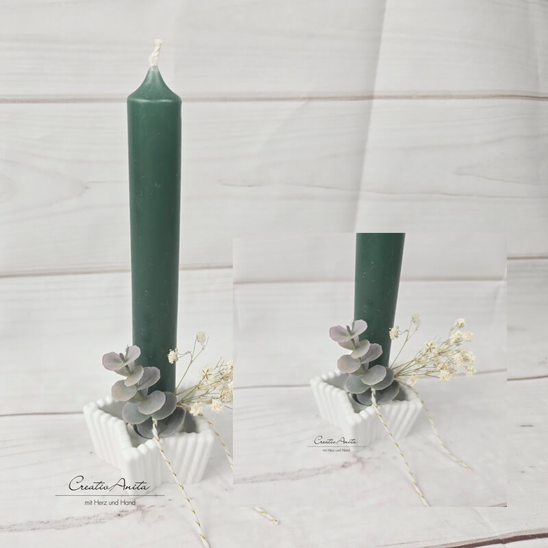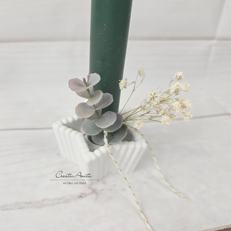 Stabkerzenhalter in Sternform mit Rillenoptik - Eukalypthus und Schleierkraut dekoriert -dunkelgrün-
