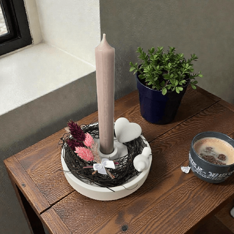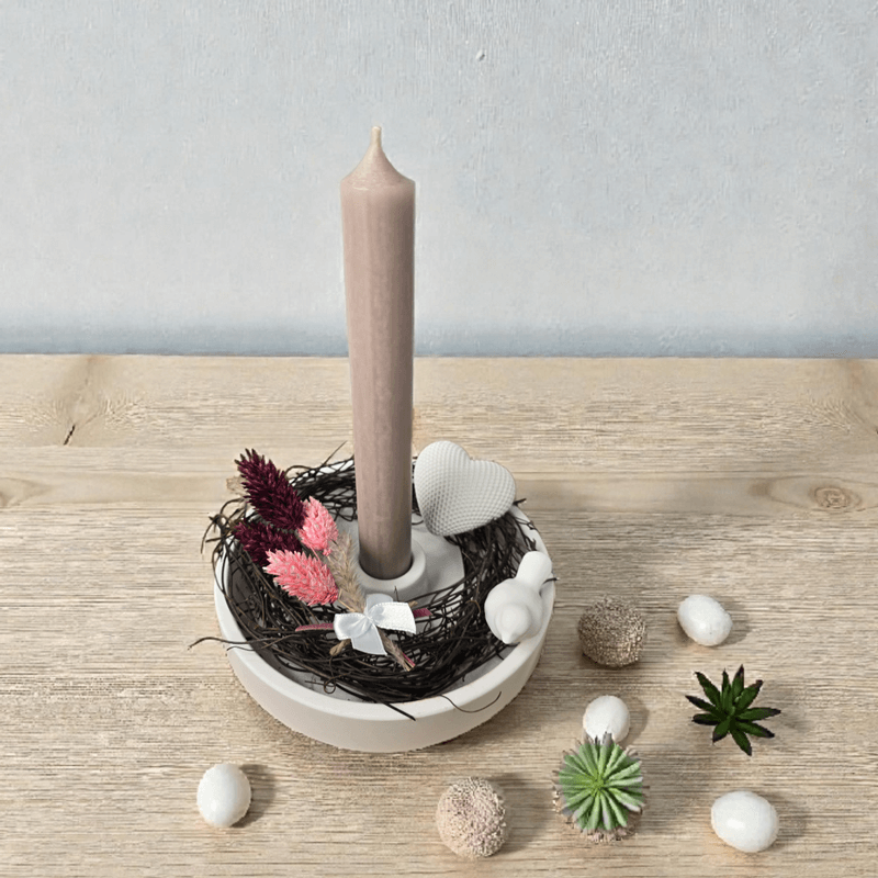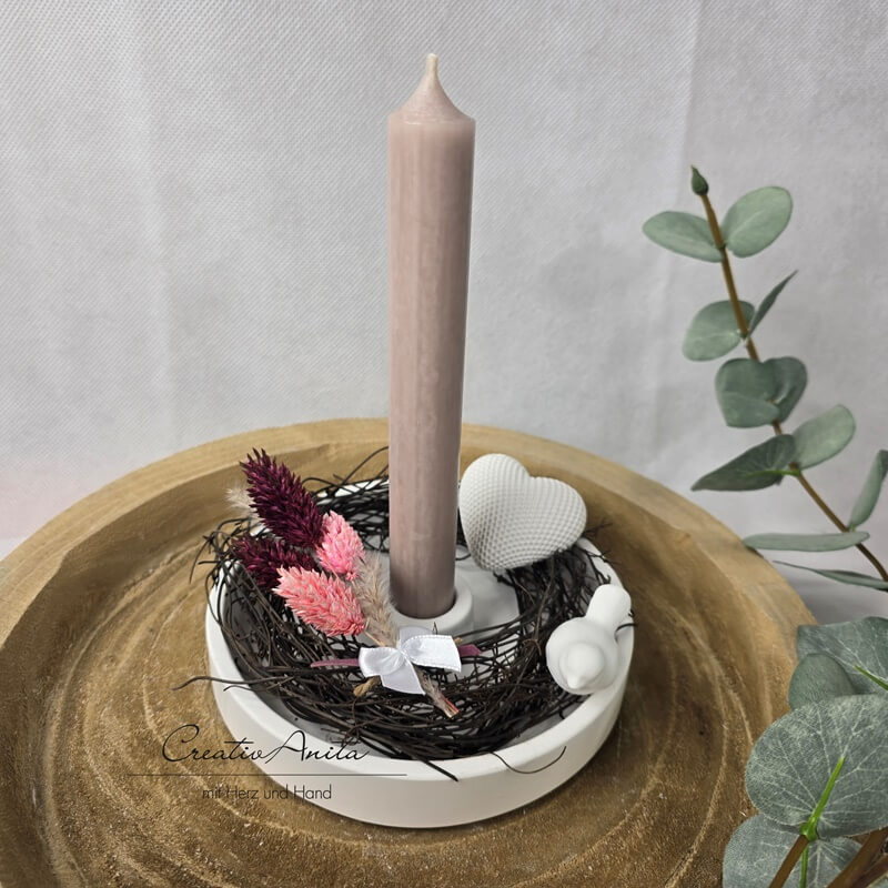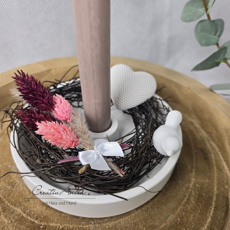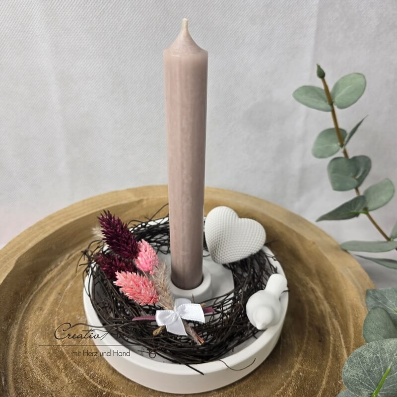 Stabkerzenhalter rund - weiß mit Kerze, Weidenkranz und Herz, Vögelchen aus Beton