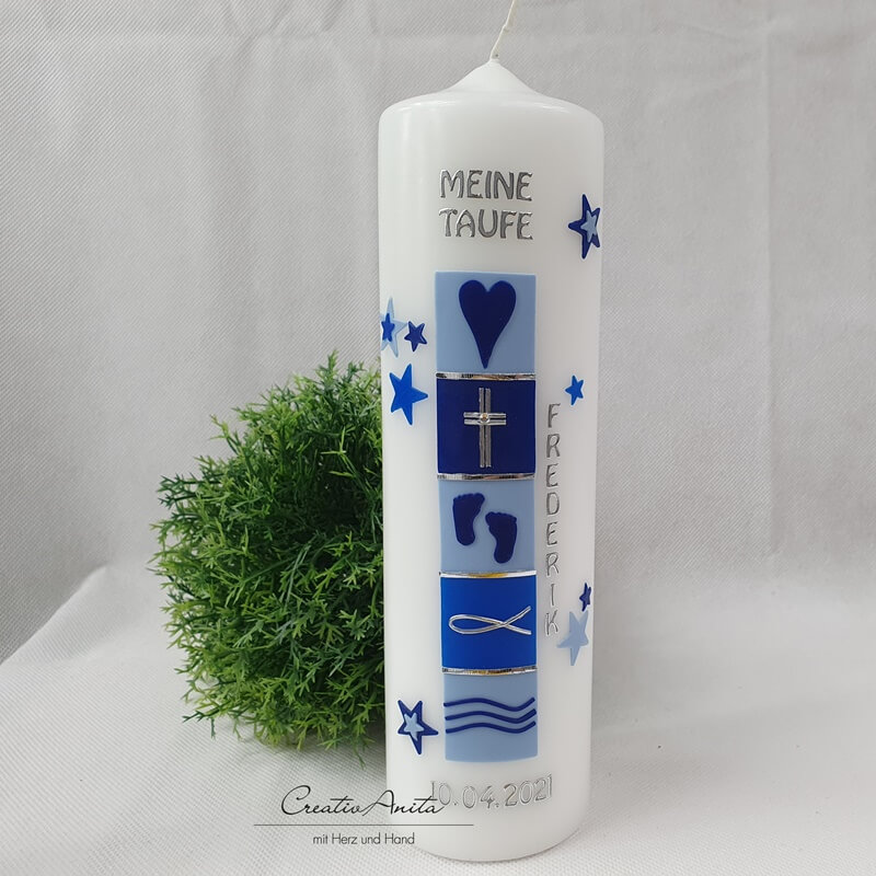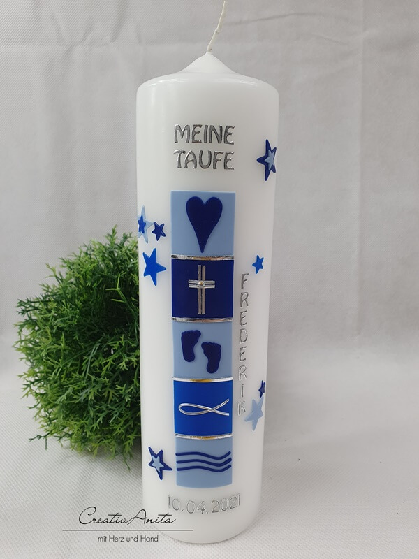 Gerne personalisieren wir die Kerze auch mit dem Namen des Täuflings und das Taufdatum. Bitte teilen Sie uns dies entsprechend mit.