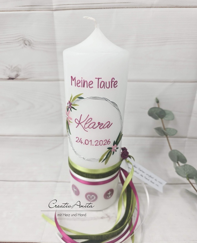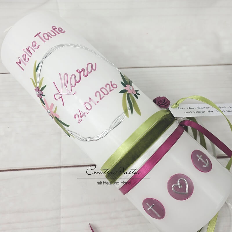 Taufkerze glatt Mädchen Blumenkreis weiß-beere perlmutt