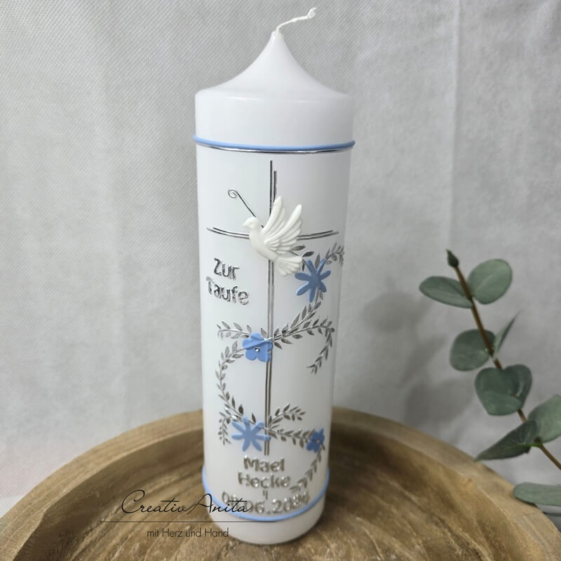 Taufkerze Kreuz - Hellblau-Silber mit Taube - Junge