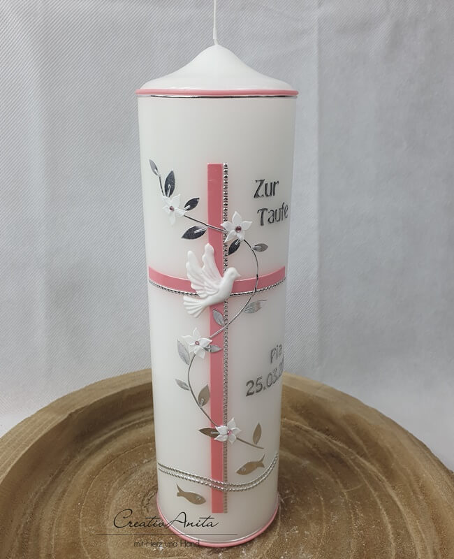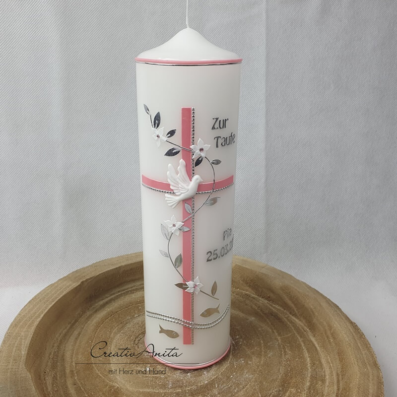 Taufkerze Kreuz - Altrosa-Silber mit Taube - Mädchen