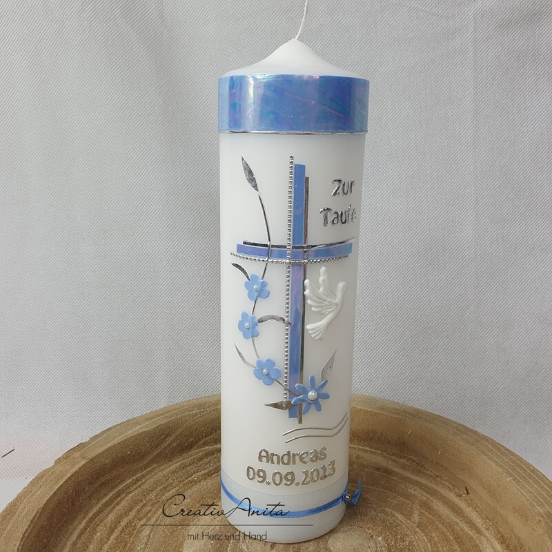 Taufkerze christlich - mittig mit Kreuz und weißer Taube. Ausdekoriert mit Blumen, diese sind mit kleinen Perlen bestückt. In den Farben Hellblau marmoriert mit Silber kombiniert!