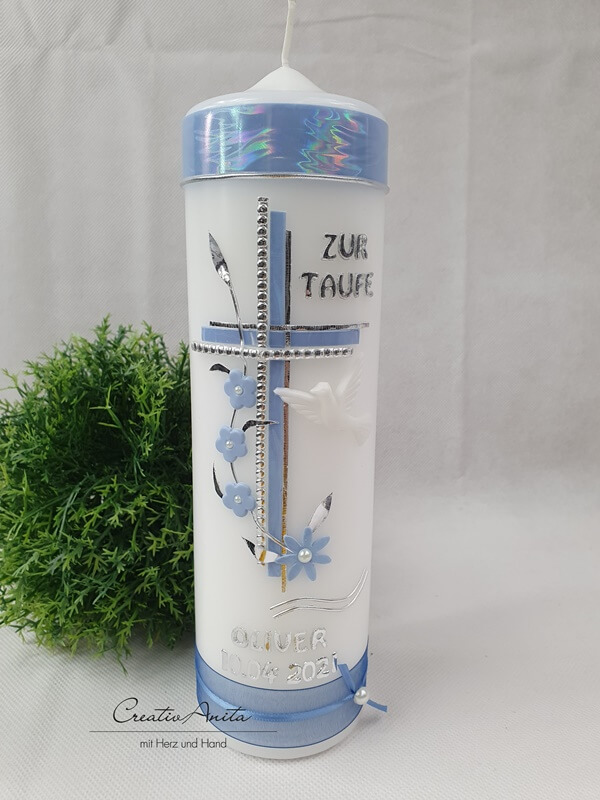 Gerne personalisieren wir die Kerze auch mit dem Namen des Täuflings und das Taufdatum. Bitte teilen Sie uns dies entsprechend mit.