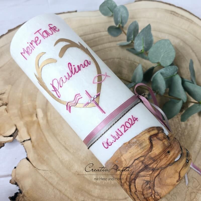 Taufkerze mit echtem Holz und mit oder ohne Teelichteinsatz -Herzgeweih-