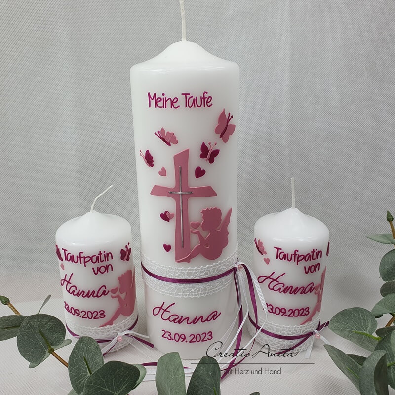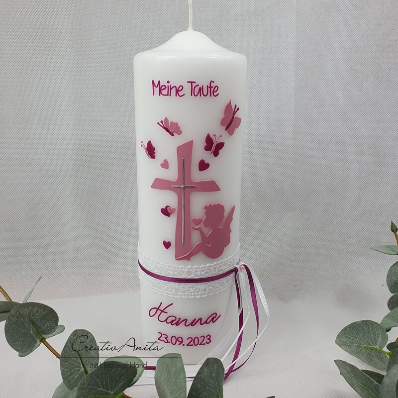 Taufkerze mit Herzen, Schmetterlinge und Engel - Altrosa-Beere - personalisiert