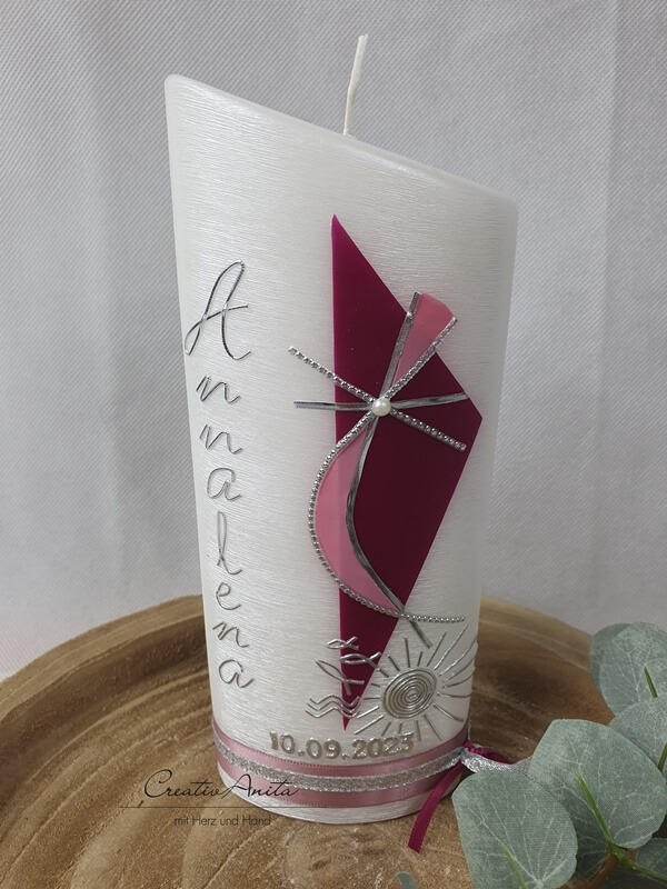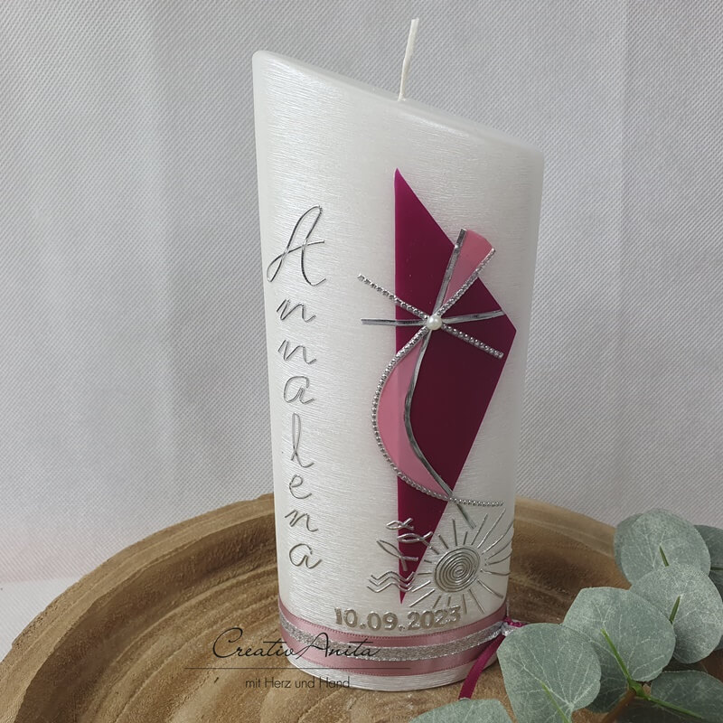 Taufkerze Perlmutt geriffelt - Ellipse abgeschrägt BEERE-ALTROSA