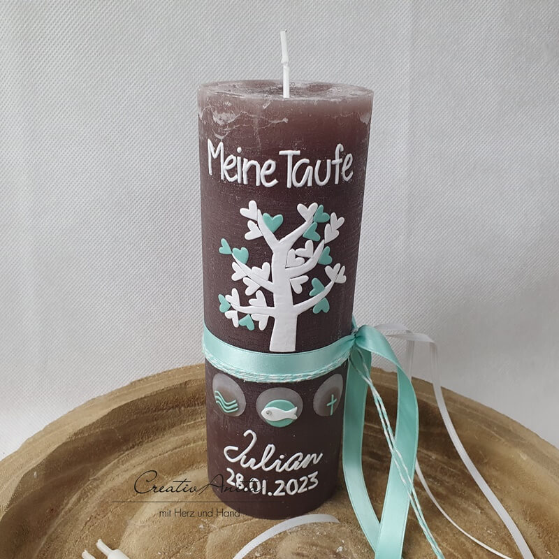 Taufkerze Rustikkerze mit Lebensbaum weiß-mint -personalisiert-