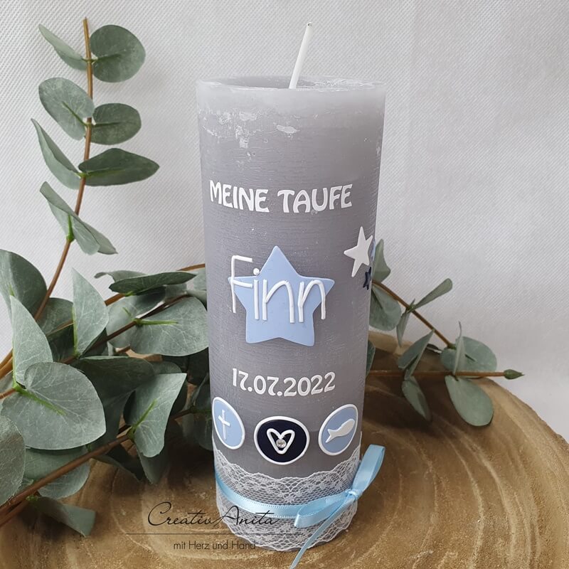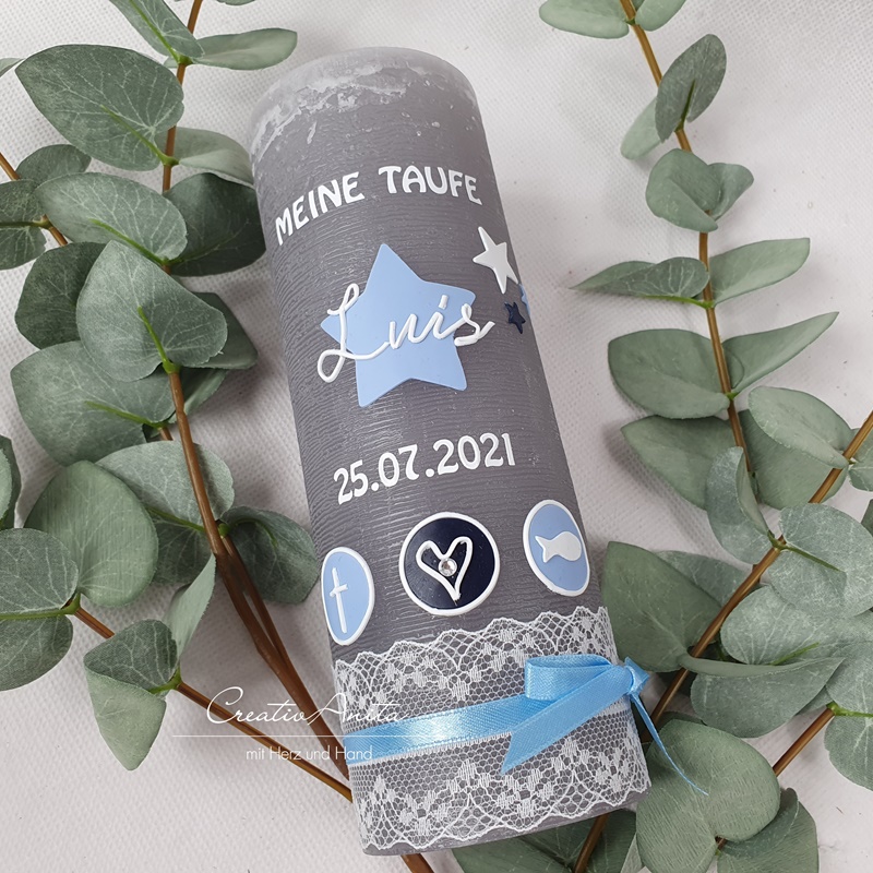 Taufkerze Rustik- Sterne grau-hellblau-weiß