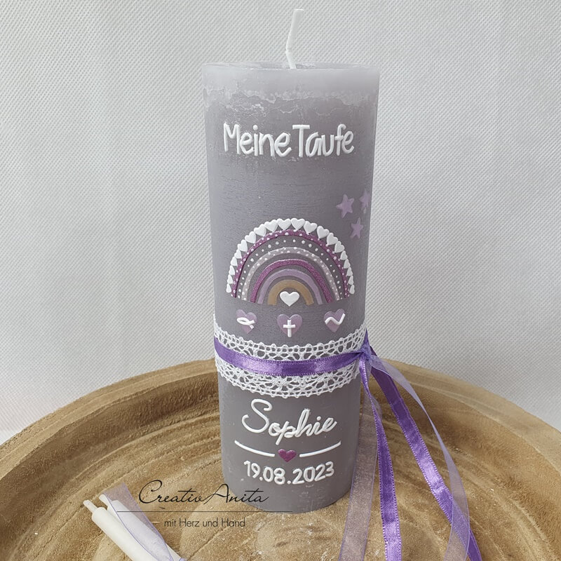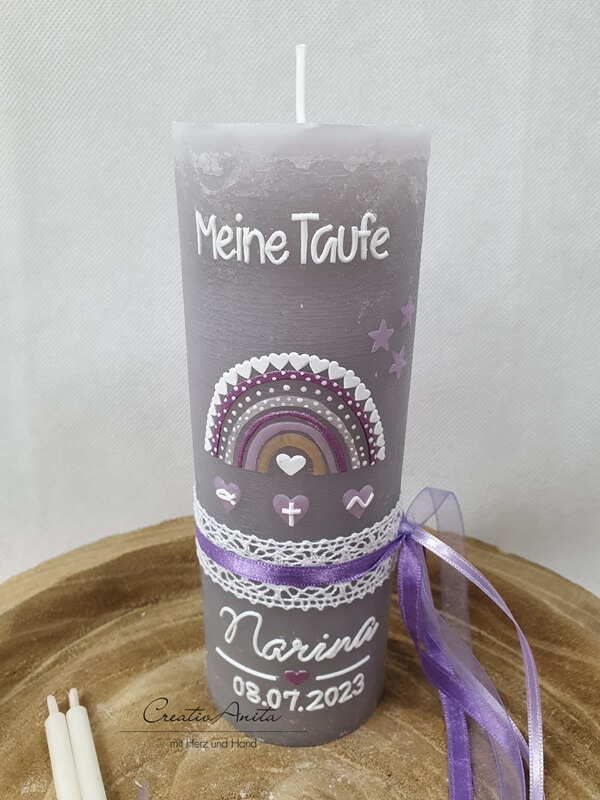 Taufkerze Rustikkerze mit Regenbogen und Herzen grau-lila-flieder verziert