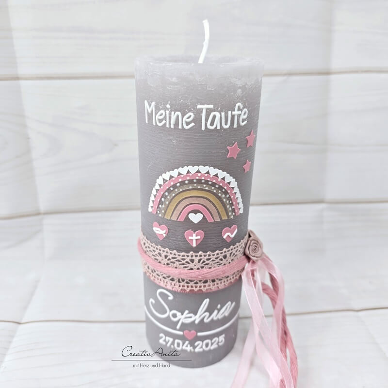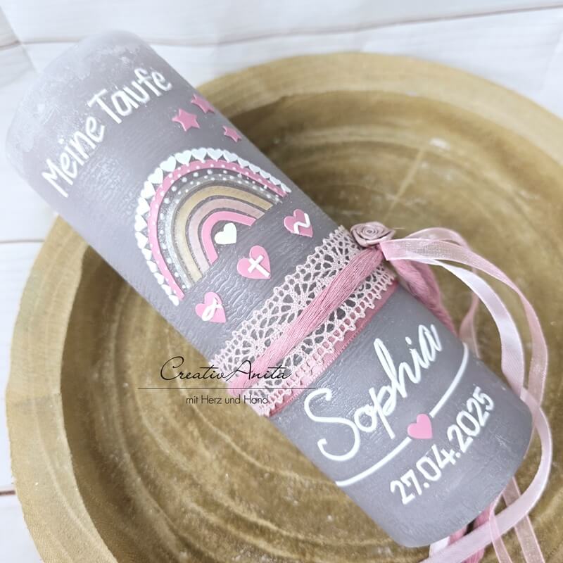Taufkerze Rustikkerze mit Regenbogen und Herzen grau-rosa verziert