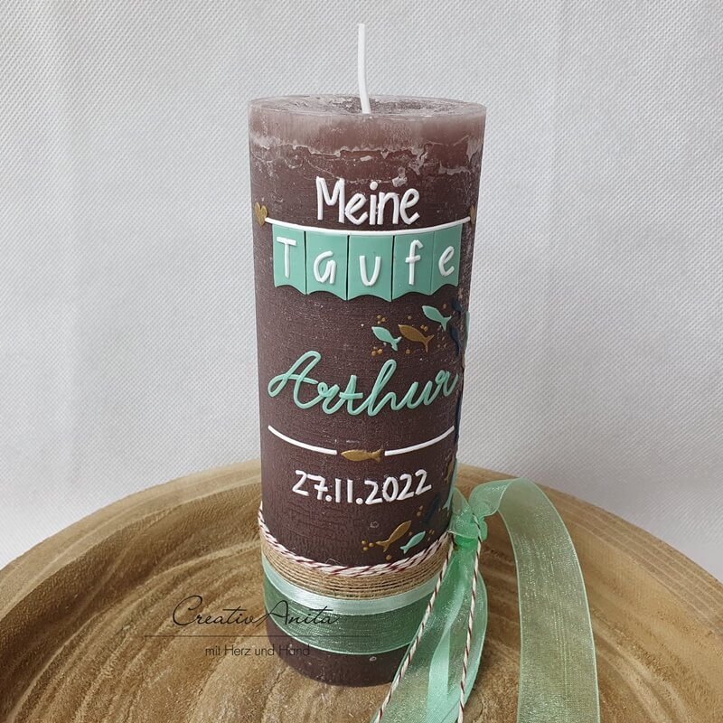 Taufkerze Rustikkerze -FISCHE- Junge - in Mint-Gold