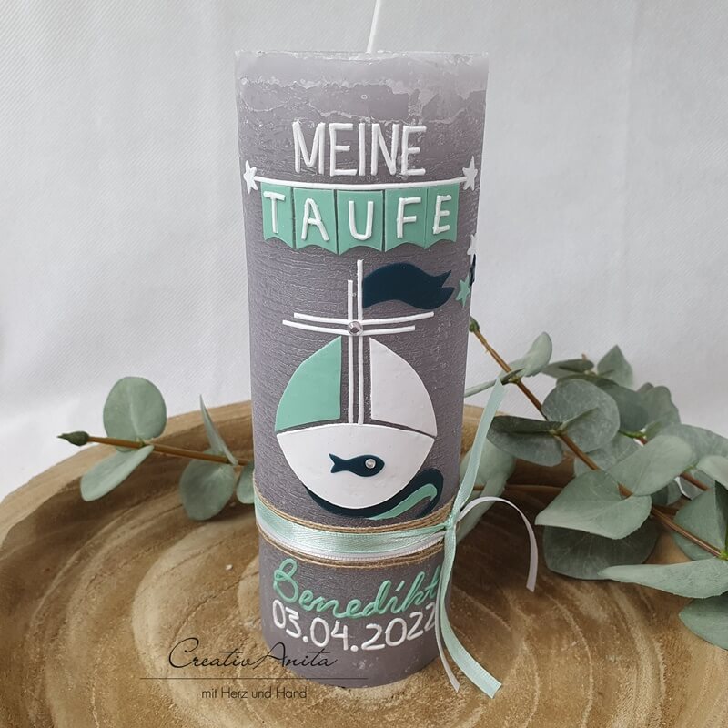 Handverzierte Kerze mit Kreuz und Boot in den Farben Weiß und Mint.