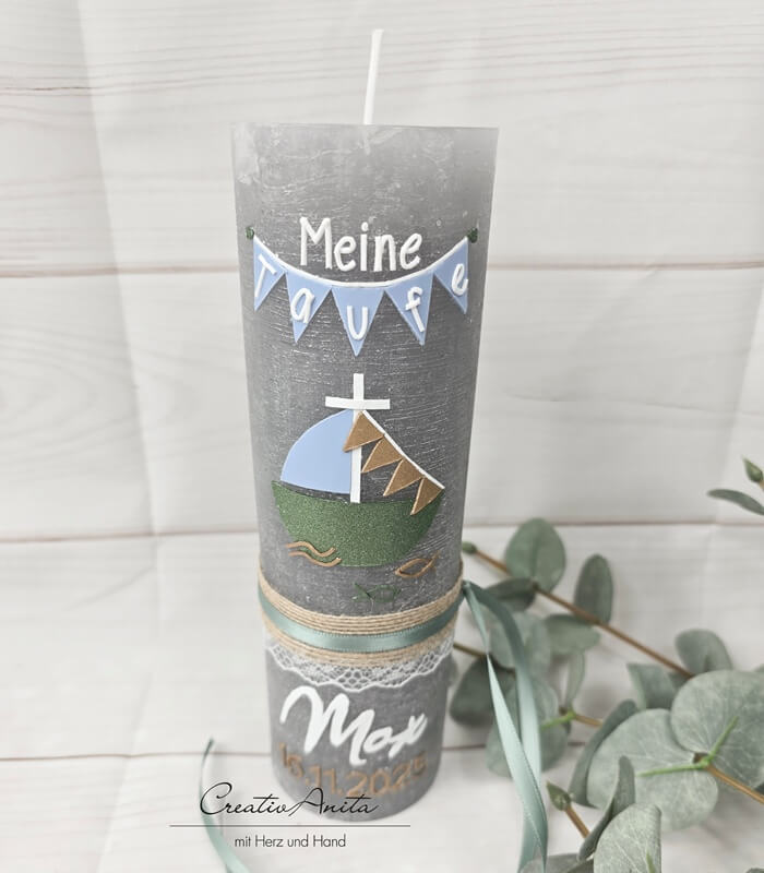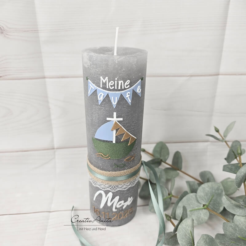 Handverzierte Kerze mit Segelboot. Christliche Symbole in Form von einem kleinen Kreuz, Fisch und Wasser werden angebracht. Farbkombination: Hellblau, Weiß, Grün metallic und mattes Gold. Gerne fertigen wir die Kerze auch in Wunschfarbe. Sprechen Sie uns einfach an.