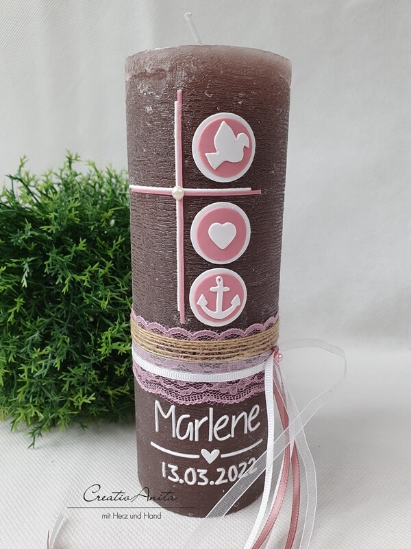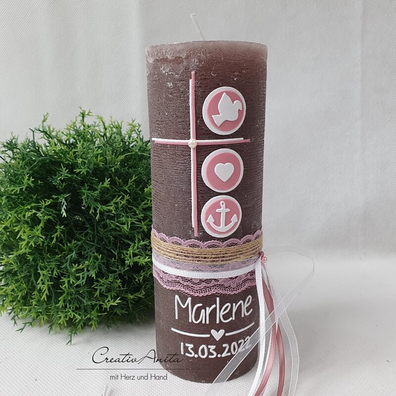 Taufkerze Rustikkerze Kreuz in altrosa-weiß