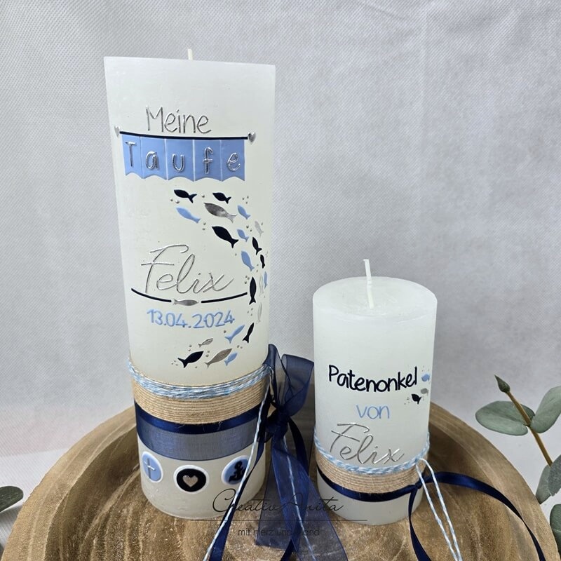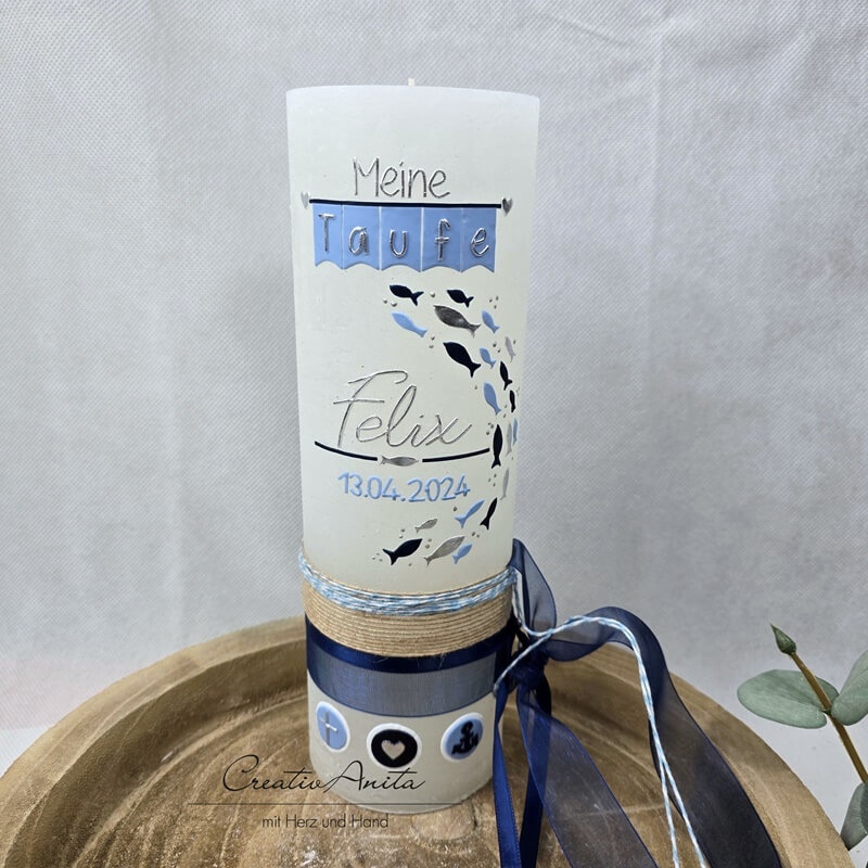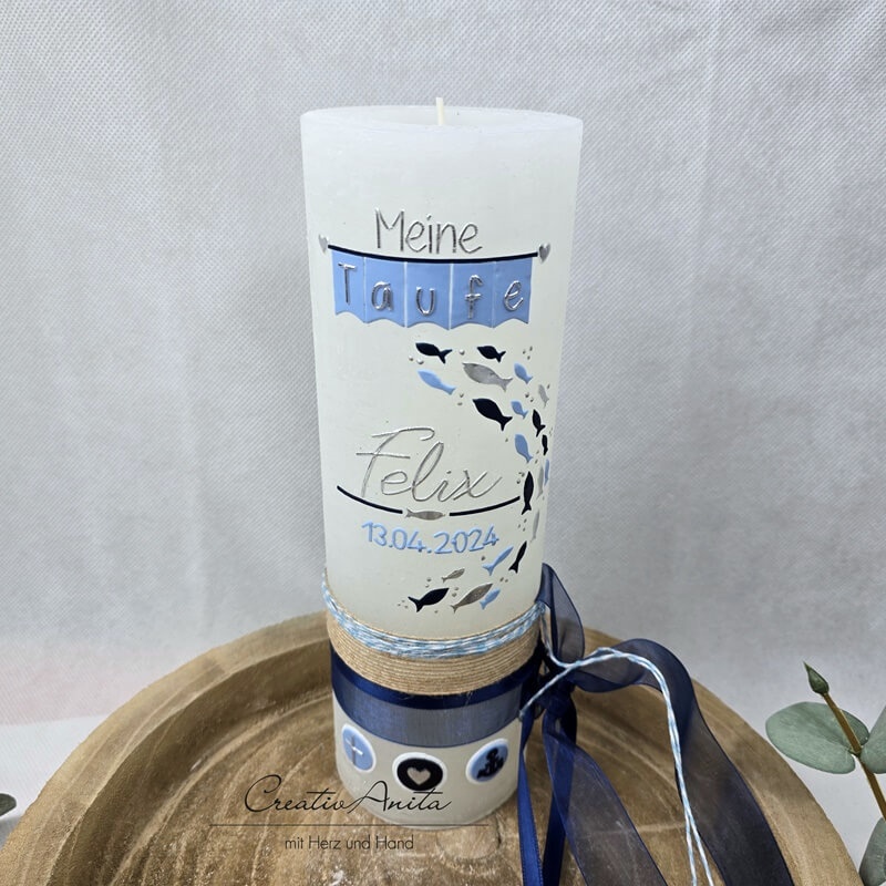 Taufkerze Rustikkerze -FISCHE- Junge - in Hellblau-Silber