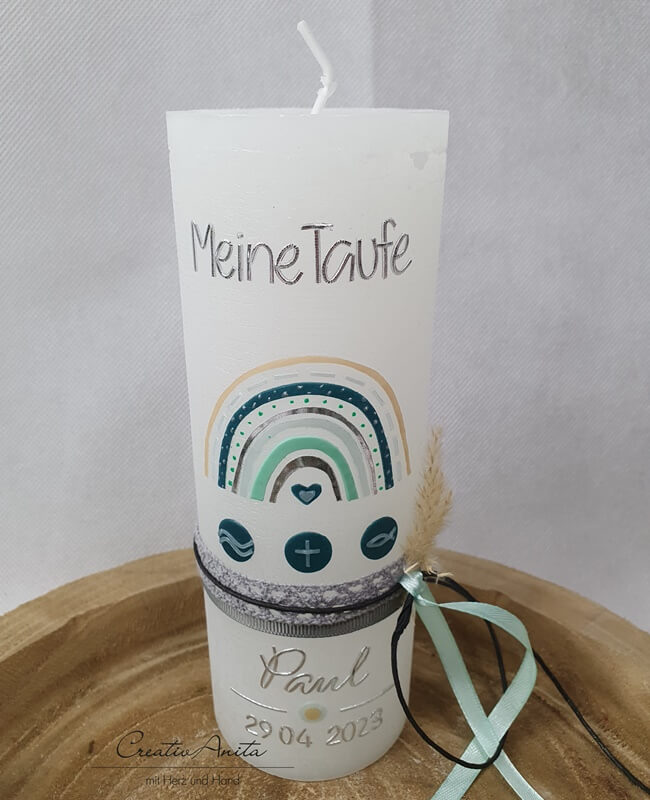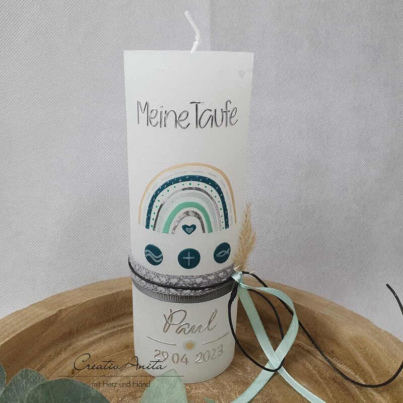 Taufkerze Rustikkerze mit Regenbogen verziert weiß-petrol-mint-silber