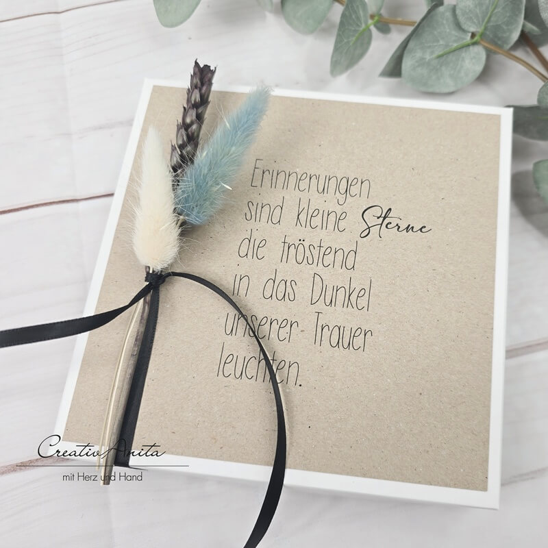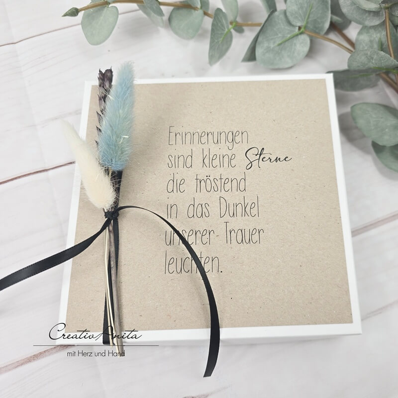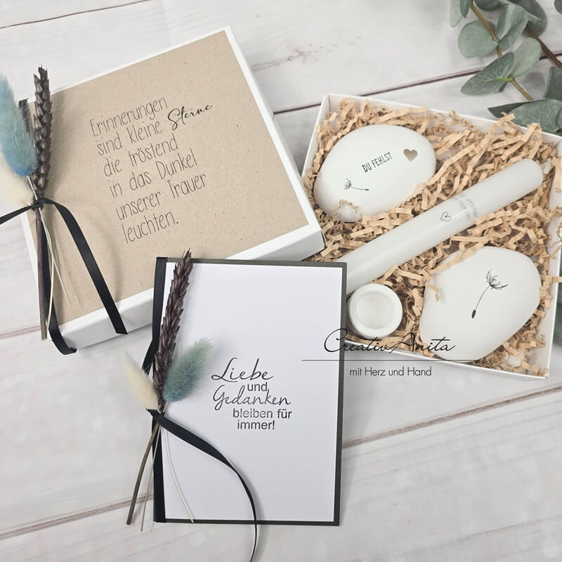 Trauerset - Trauerbox mit Karte, Erinnerungssteine, Kerzenständer und Erinnerungskerze mit Spruch und Blumen dekoriert