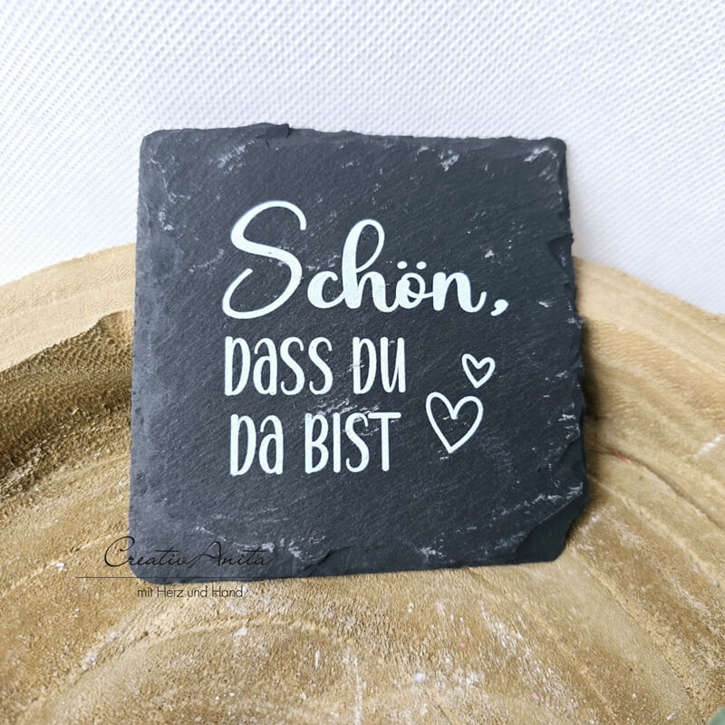 Untersetzer mit Spruch -Schön, dass Du da bist- geradlinig aus Schiefer