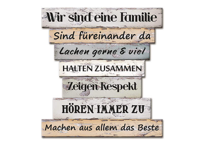 In wunderschöner Gestaltung in verwittertem Look zeigt sich dieses Wandbild "Familienregeln".