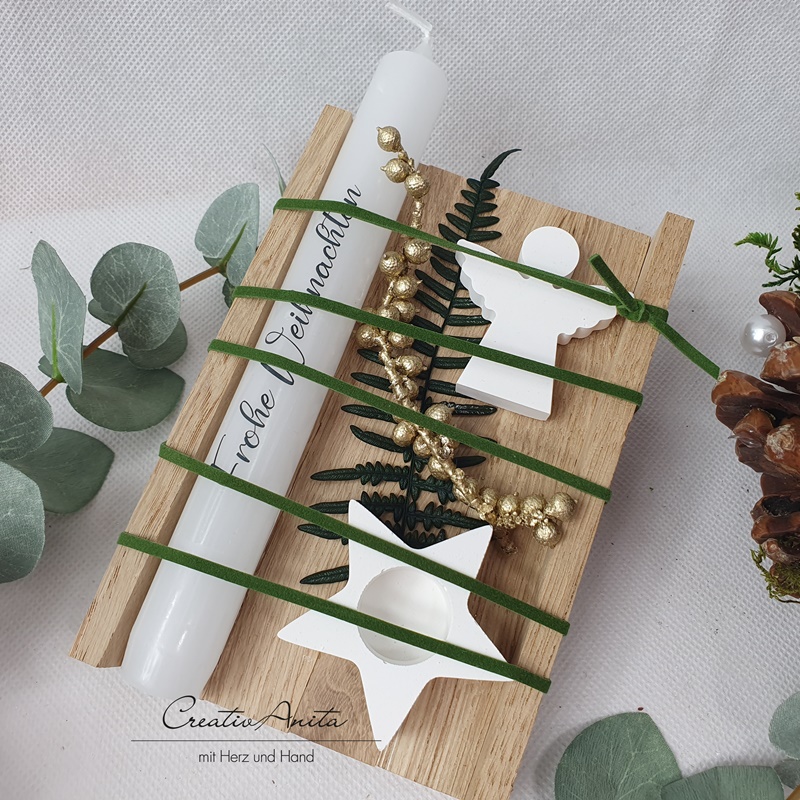 Die handgemachte Holzverpackung wurde mit einer Kerze "Frohe Weihnachten", einem Kerzenständer in Sternform und einem Schutzengel befüllt. Alles zusammen kann auf der Holzverpackung trapiert werden.