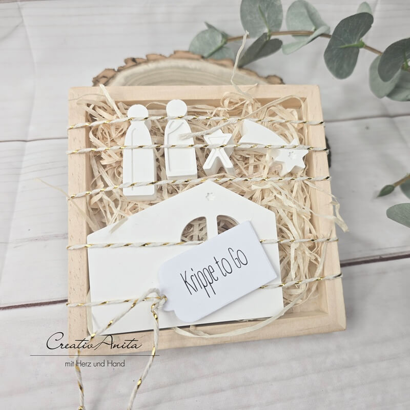 Die -Krippe to go- in der Holzbox besteht aus der Stallsilhoutte, Bethlehemstern, Josef, Maria und dem kleinen Christkind.