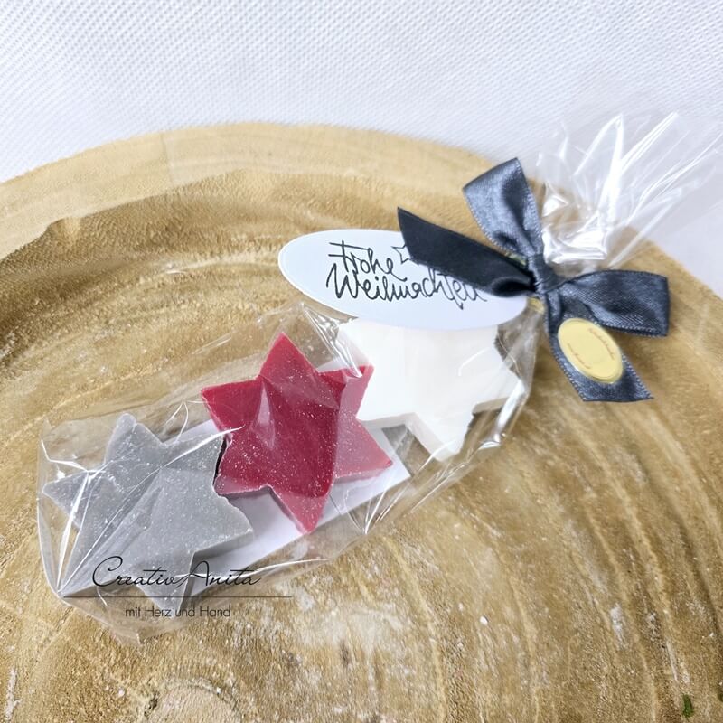 3 Stück Seifensterne Midi in den Duftnoten -SCHNEEROSE-WINTERZAUBER-CHRISTROSE- verpackt in Cellophan mit handbestempeltem Anhänger "Frohe Weihnachten", dekoriert mit einem kleinen Schleifchen.